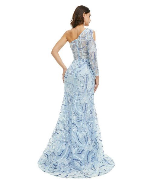 One shoulder long sleeve slit mermaid blue sexy formal evening dress with train wholesale online