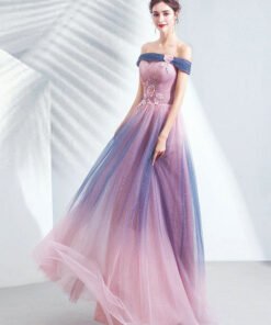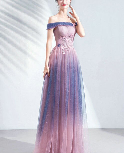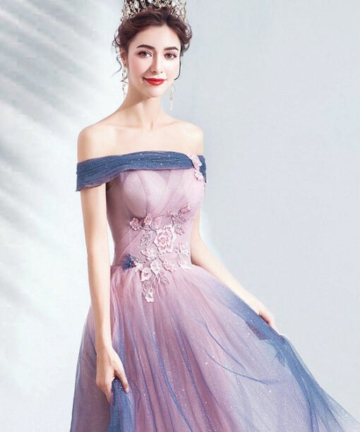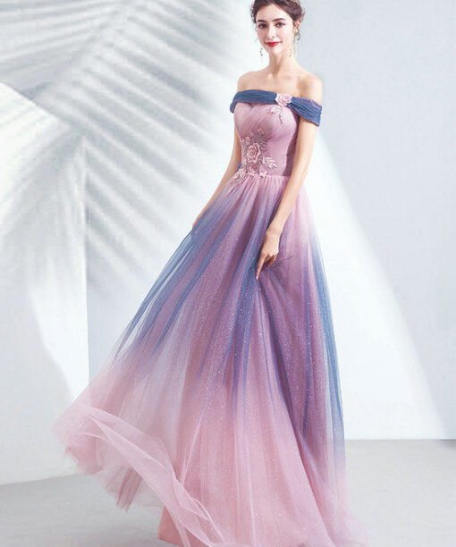 Pink And Blue Prom Dress Off The Shoulder A Line Evening Dress