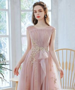 Pink and gold prom dress round collar a line sleeveless gold sparkly lace long floor length formal dress.