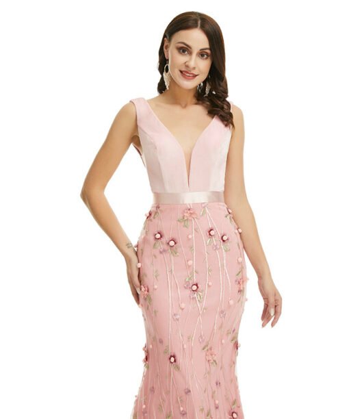 Pink floral prom dress v neck mermaid sleeveless zipper back floor length open back formal wedding guest dress bridesmaid dress online.