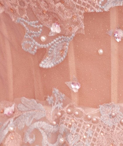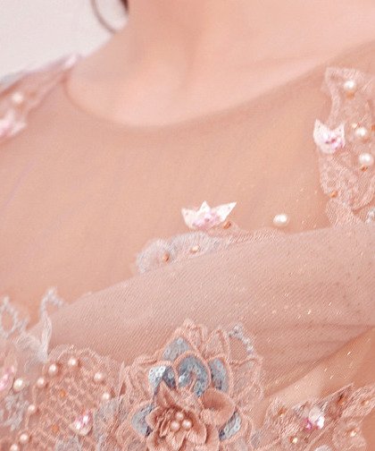 Pink formal dress affordable round collar a line short sleeve floor length lace up pearl lace flowers prom dress 2021 for sale