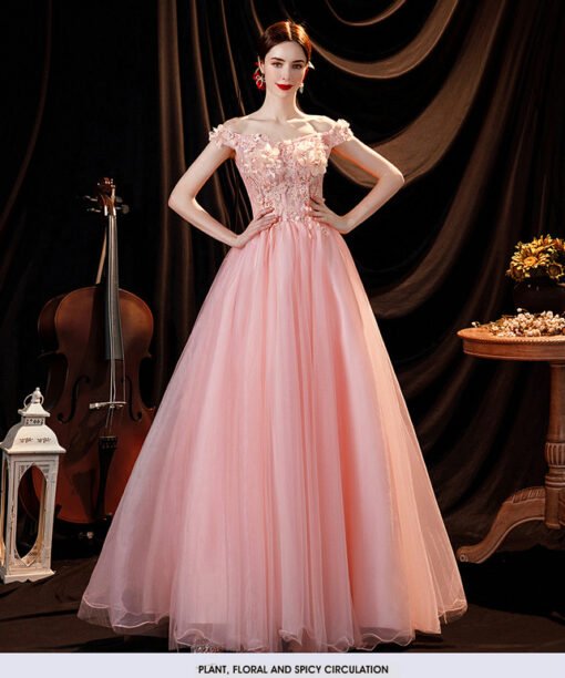 Pink formal dress off the shoulder a line floor length lace up flower lace beaded long formal dress 2021 wholesale
