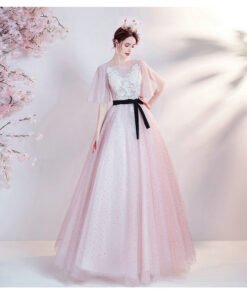 Pink lace prom dress round collar ball gown floor length short sleeves beaded lace up back affordable sweet 15 quinceanera dress.