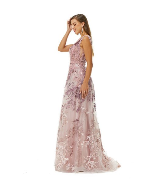 Pink lace prom dress v neck a line sleeveless floor length open back wedding guest dress for sale online.
