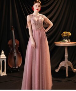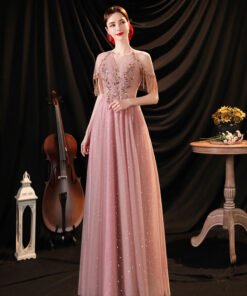 Pink prom dress long affordable v neck a line floor length long beaded evening dress 2021 wedding guest dress for sale