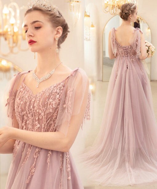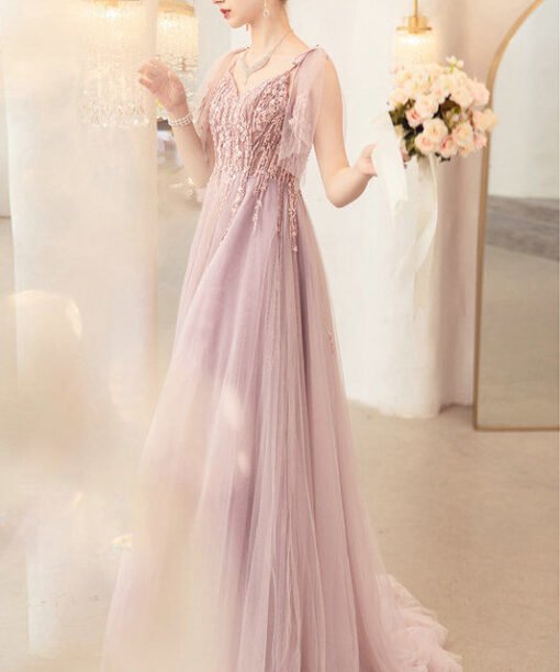 Pink prom dress plus size v neck a line long lace up open back formal birthday party dress affordable bridesmaid dress wholesale