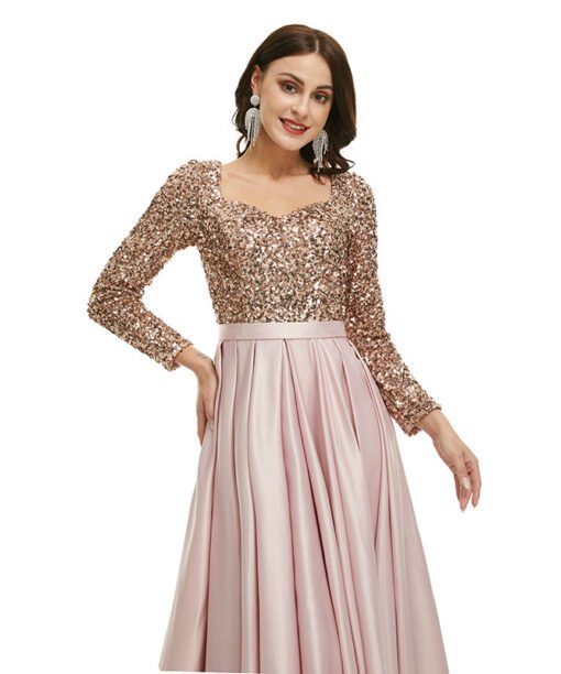 Pink satin prom dress affordable long sleeve a line sequins zipper back floor length sweetheart long bridesmaid dress wholesale.