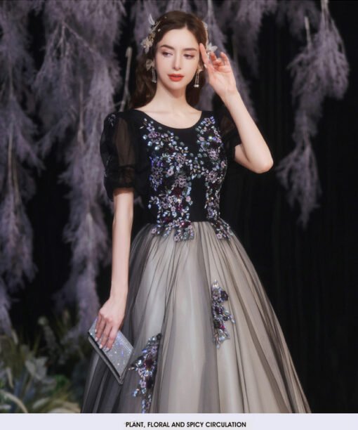 Quinceanera dress black round collar short sleeve ball gown floor length lace up embroidery flower lace prom dress for sale.