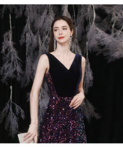 Red and black dress v neck a line sleeveless floor length long sparkly colorful wedding guest dress formal bridesmaid dress.