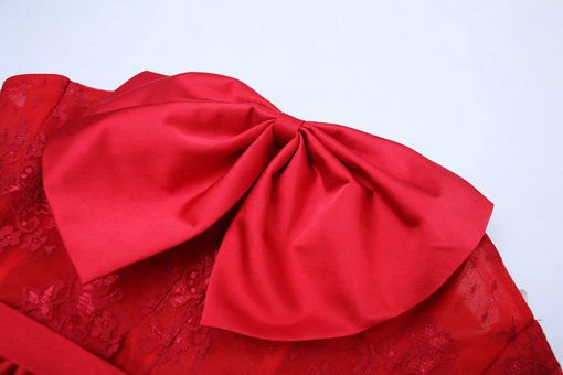 Strapless a line red evening dress with train. Strapless bowknot lace up evening dress for wedding.