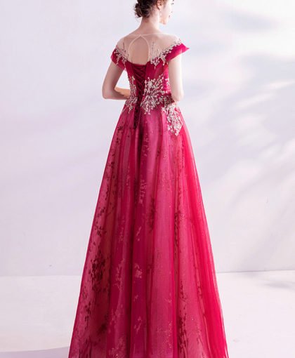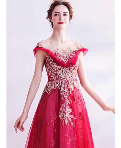 Red Evening Gown Round Collar A Line Cap Sleeve Long Prom Dress