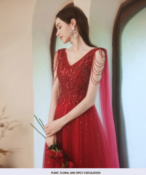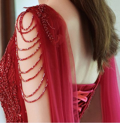 Red prom dress with cape v neck a line long floor length cape sleeve beaded lace up formal dress evening dress for sale