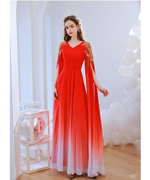 Red prom dresses 2022 v neck a line cape sleeve long sleeve gold beaded chiffon formal evening dress 2022 wholesale.