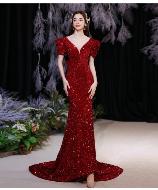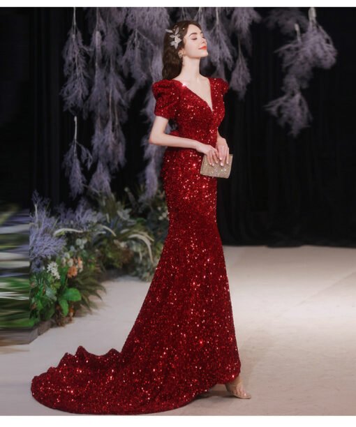 Red sequin prom dress v neck short sleeve mermaid sexy bling evening dress wedding guest dress with train for sale.