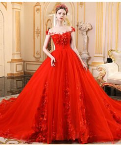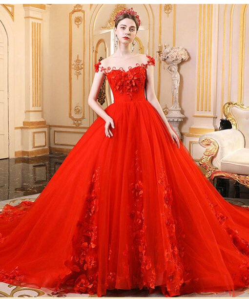 Red wedding gowns off the shoulder ball gown lace flowers long train princess wedding dress formal prom dress with train