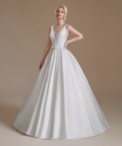 Satin ball gown wedding dress strap v neck sleeveless floor length side zipper lace bridal gown wholesale.