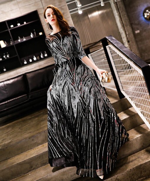 Silver and black prom dress round collar a line 1/2 sleeve floor length long formal dress wedding guest dress for sale online
