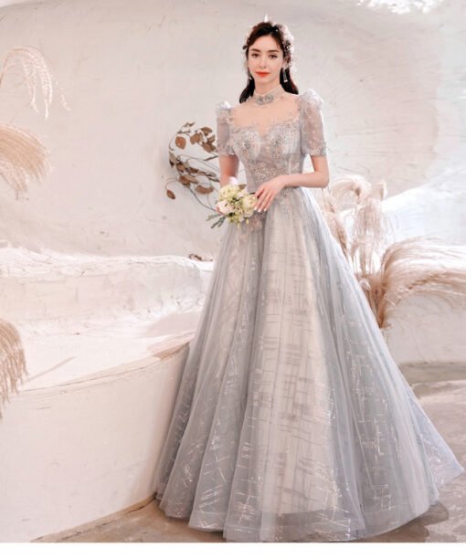 Silver formal dress high neck ball gown paillette bling lace beaded floor length lace up hole back affordable prom dress 2021.