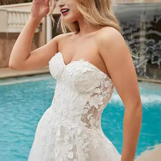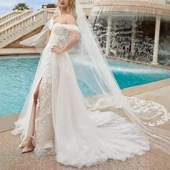 Slit wedding dress off the shoulder sweetheart a line lace applique gorgeous formal bridal gown with train for sale.