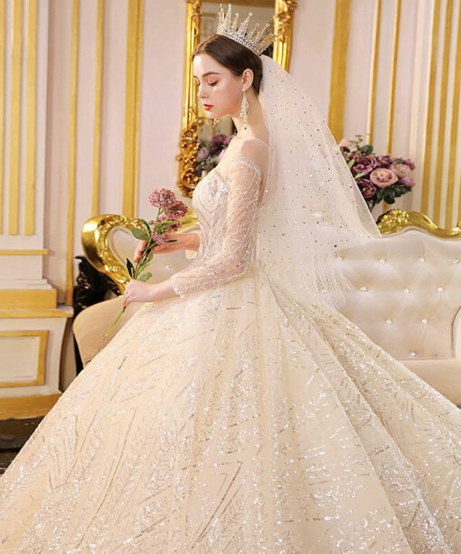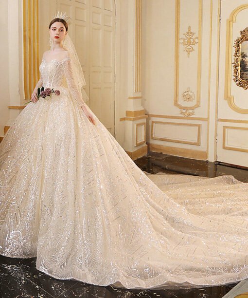 Sparkly ball gown wedding dress round collar long sleeve off the shoulder long train bling lace haute couture bridal gown 2020