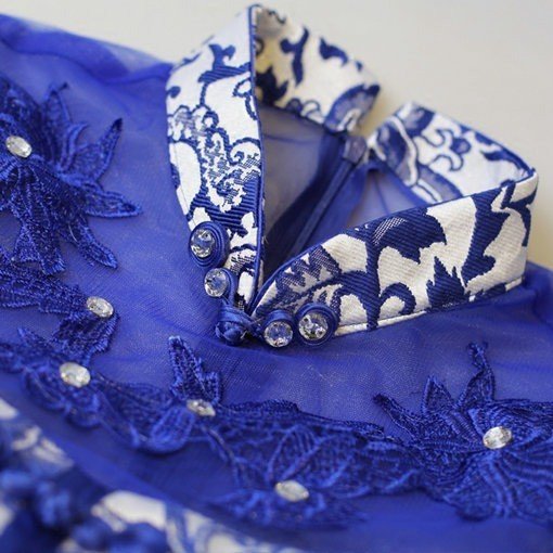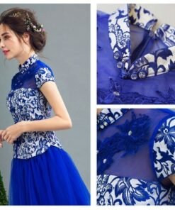 Stand neck a line blue evening gown. Short sleeves printing beaded lace long evening gown online