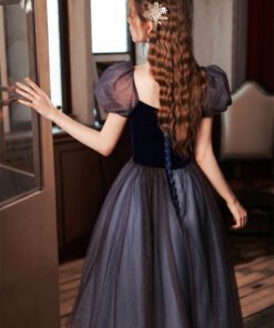 Tulle prom dress square neckline low cut short puffy sleeves blue ball gown floor length long formal dress wholesale online.