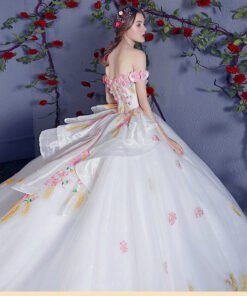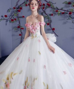 Wedding dress with pink flowers off the shoulder ball gown princess long train white and pink prom dress bridal gown wholesale