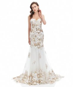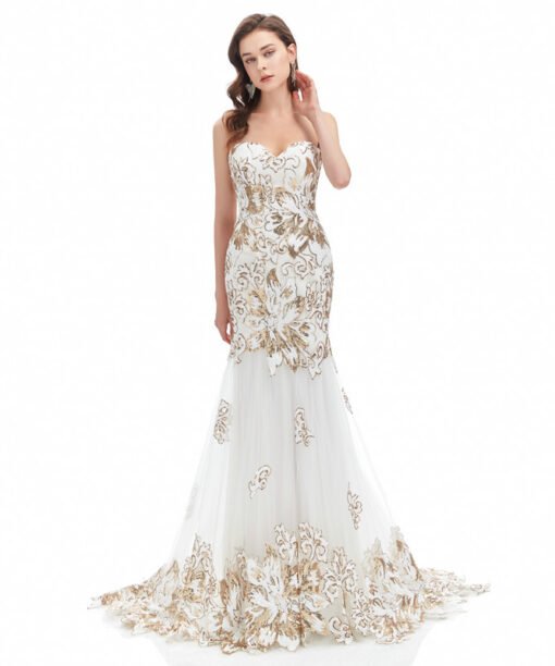 White and gold prom dress strapless mermaid lace wedding guest dress with train pink and black gold and black three colors available.