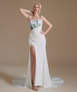 White mermaid prom dress with green embroidery flowers spaghetti strap sweetheart side split sexy evening dress with train