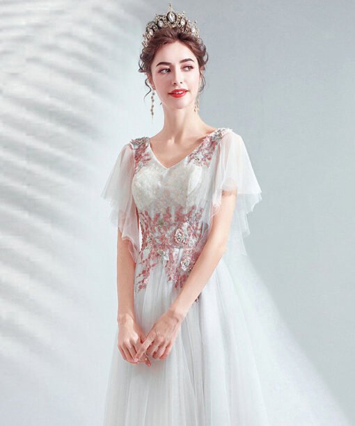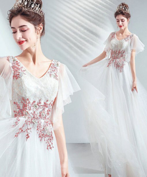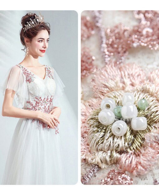 White prom dress v neck a line embroidery beaded floor length long princess formal birthday party dress lace up open back wholesale
