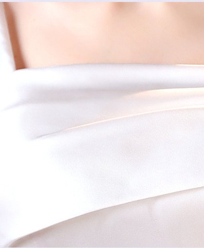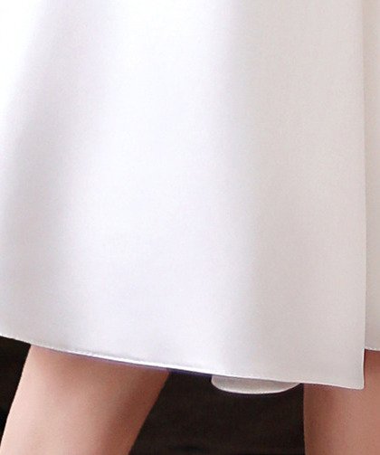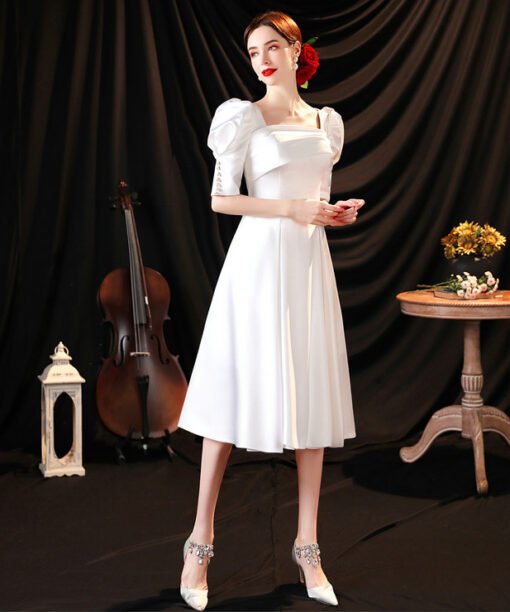White satin cocktail dress square neckline a line keen length puffy short sleeve zipper back short prom dress for sale.