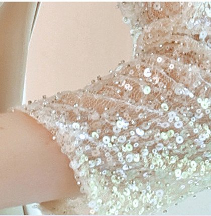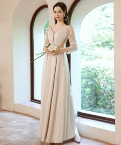 White satin prom dress v neck a line beaded long sleeve floor length zipper open back autumn formal evening dress for sale.