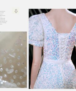 White sparkly prom dress round collar a line colorful paillette puffy short sleeve bling evening party dress wholesale